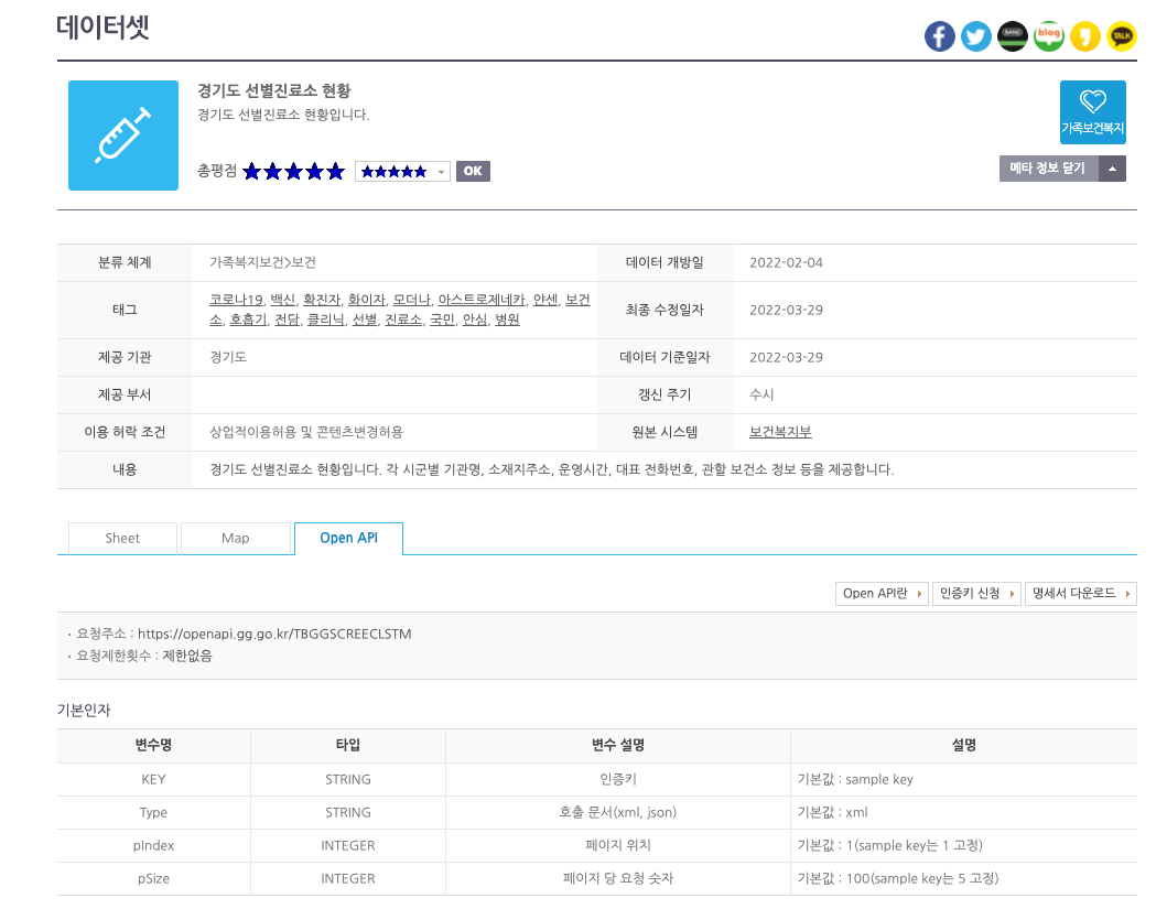 가져오려는 데이터는 경기도 데이터 드림의 코로나 선별 진료소 관련 데이터이다.