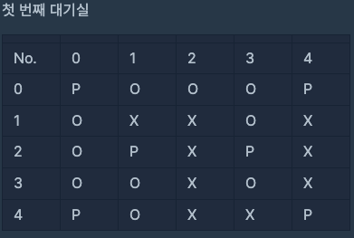 대기실의 크기는 5 X 5로 고정되어 있으므로 무난하게 2중 for문을 쓰도록 하자