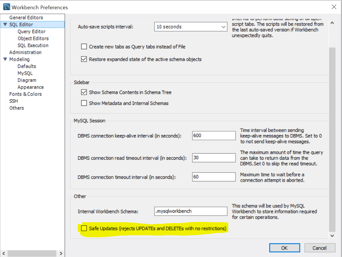 만약 데이터 수정, 삭제를 할 때 오류가 생긴다면 MySQL 워크밴치의 설정을 수정해주어야 한다.
