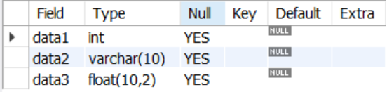 예시로 든 test_table1 에는 data1은 int형, data2 는 varchar 형, data3 은 float형임을 DESC 구문을 통해 확인할 수 있다.